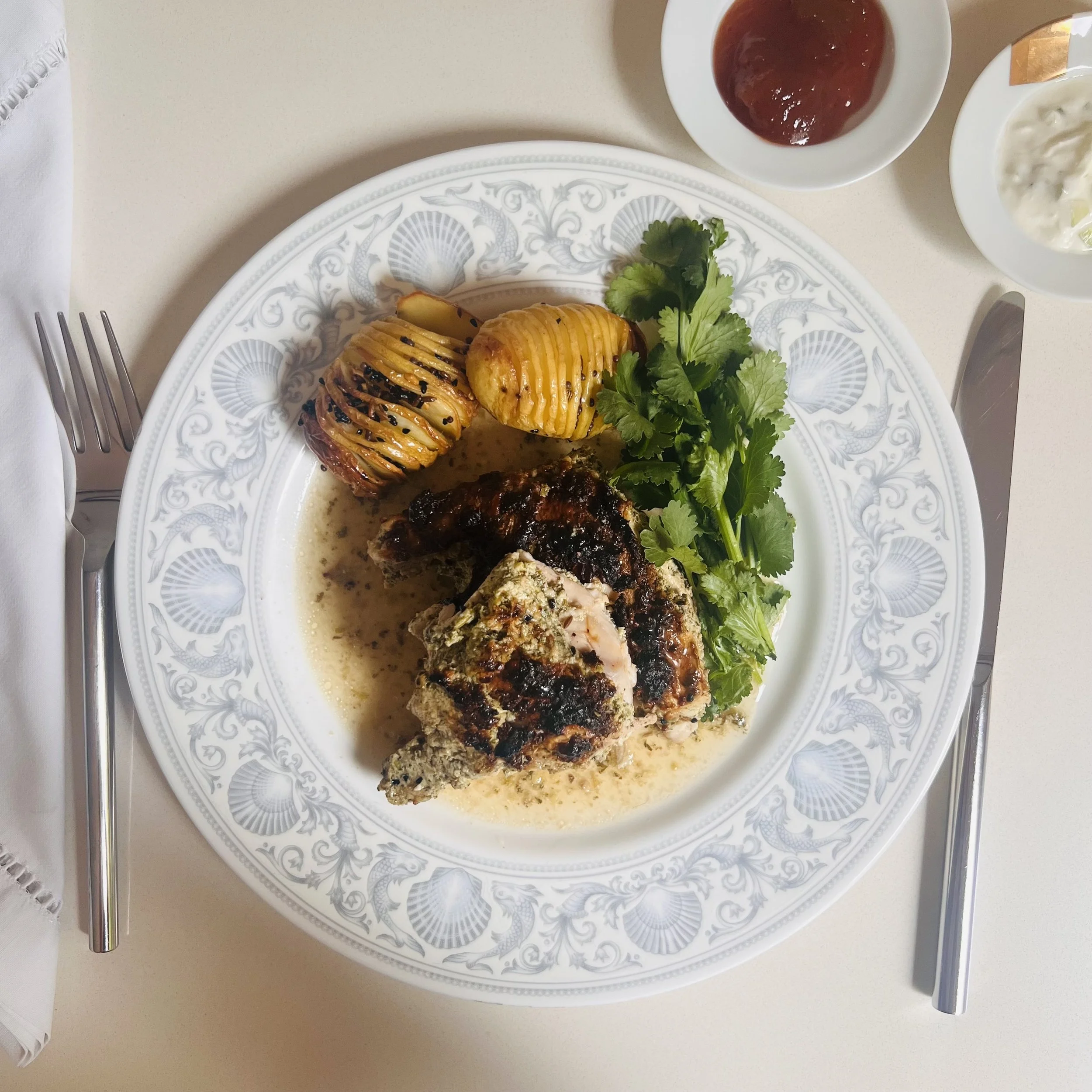 Place the spatchcock halves or chicken thighs in a non-reactive bowl, pour over the marinade and massage into all sides of the spatchcock/chicken thighs. Allow to marinate in the fridge at least 3 hours or overnight.
