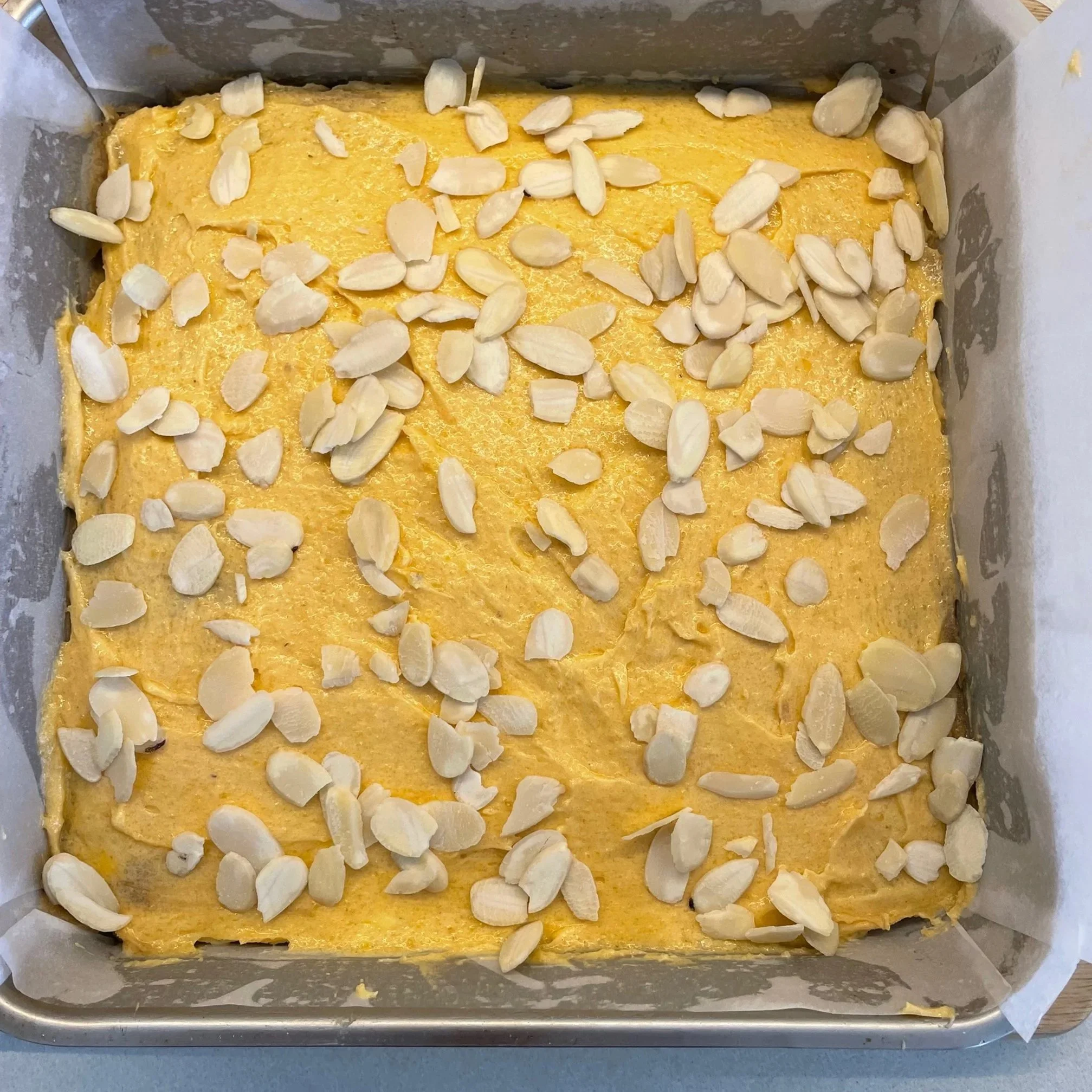 Whisk the frangipane with a fork and spread an even layer on top of the Blondie. Sprinkle flaked almonds on top if you’re using them.