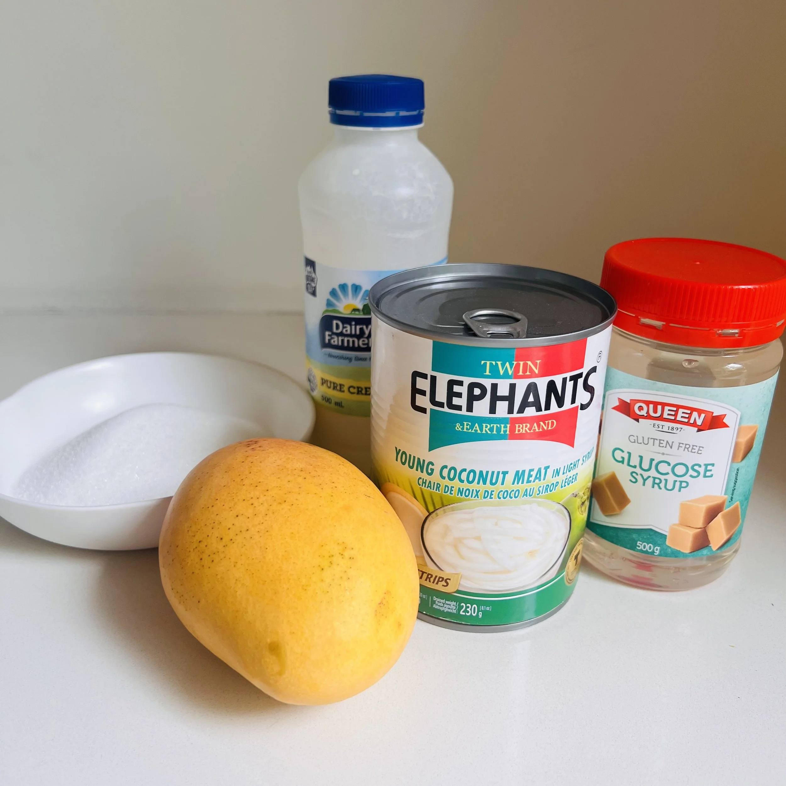 In a food processor or with a stick blender, puree the mango flesh with the caster sugar until smooth. Weigh out 195 gm. Place in the fridge.