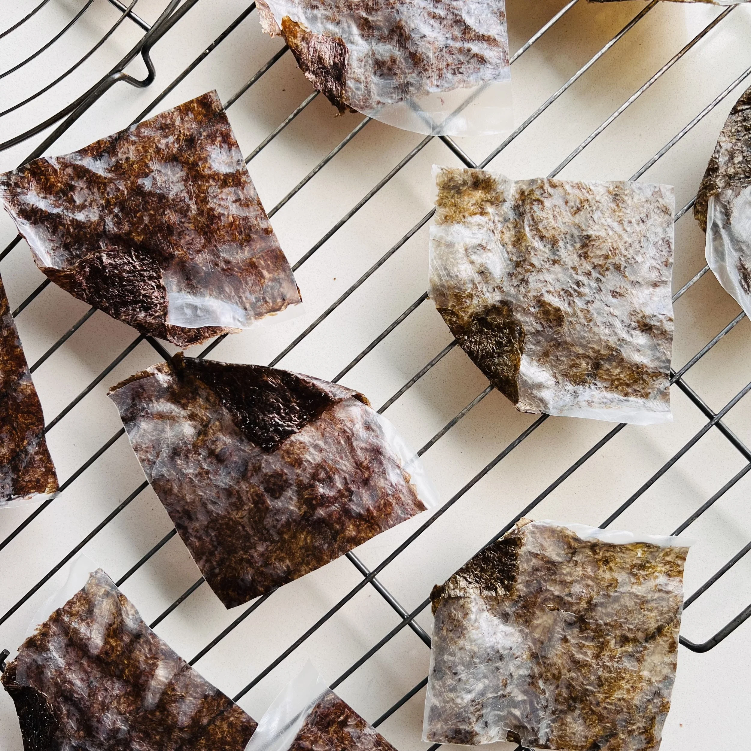 Quickly dip the rice paper rounds in water. Firmly press a nori sheet onto the damp rice paper round, tucking in the nori corners.