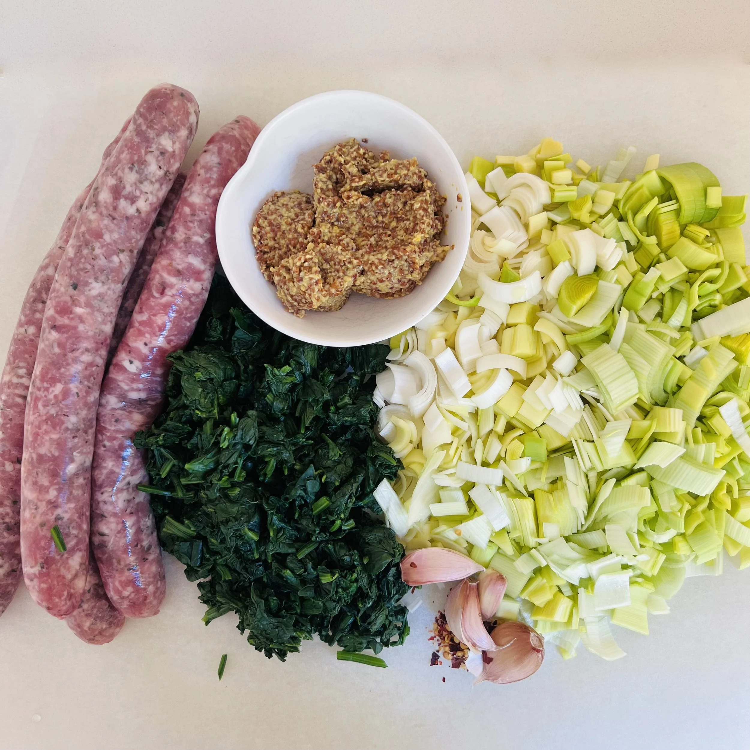 Heat olive oil in a frying pan and add the leek, garlic and chilli flakes if using. Sauté until the leek has softened and is taking on a slight colour. Add the chopped spinach and the mustard and mix well. Remove from the heat and allow to cool completely before stuffing the veal.
