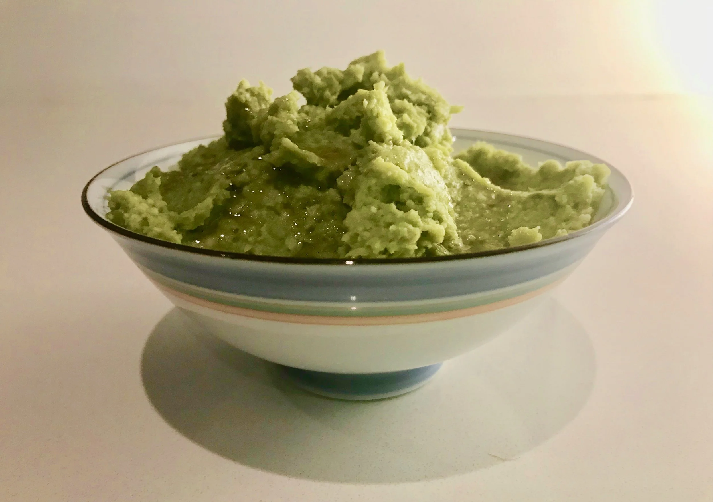 Transfer to a food processor along with the crème fraiche and process until you have a textured puree, adding reserved soybean/pea water as needed to achieve your required consistency. Add wasabi to taste then season with salt and freshly ground black pepper.