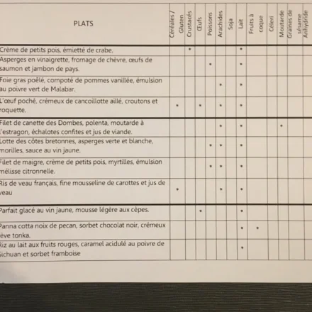 Recently I came across a restaurant in Lyon, France, called Le Jean Moulin that has implemented another way to help diners. At the back of the menu is a chart cross-referencing every dish that comes out of the kitchen with the most common forms of food-related allergies and intolerances. So, for example, if you wanted to order the veal sweetbreads with carrot mousse and veal jus you could see that hidden in that oh-so-French of entrees are ingredients containing gluten, plus peanut and milk products. What a nifty idea.