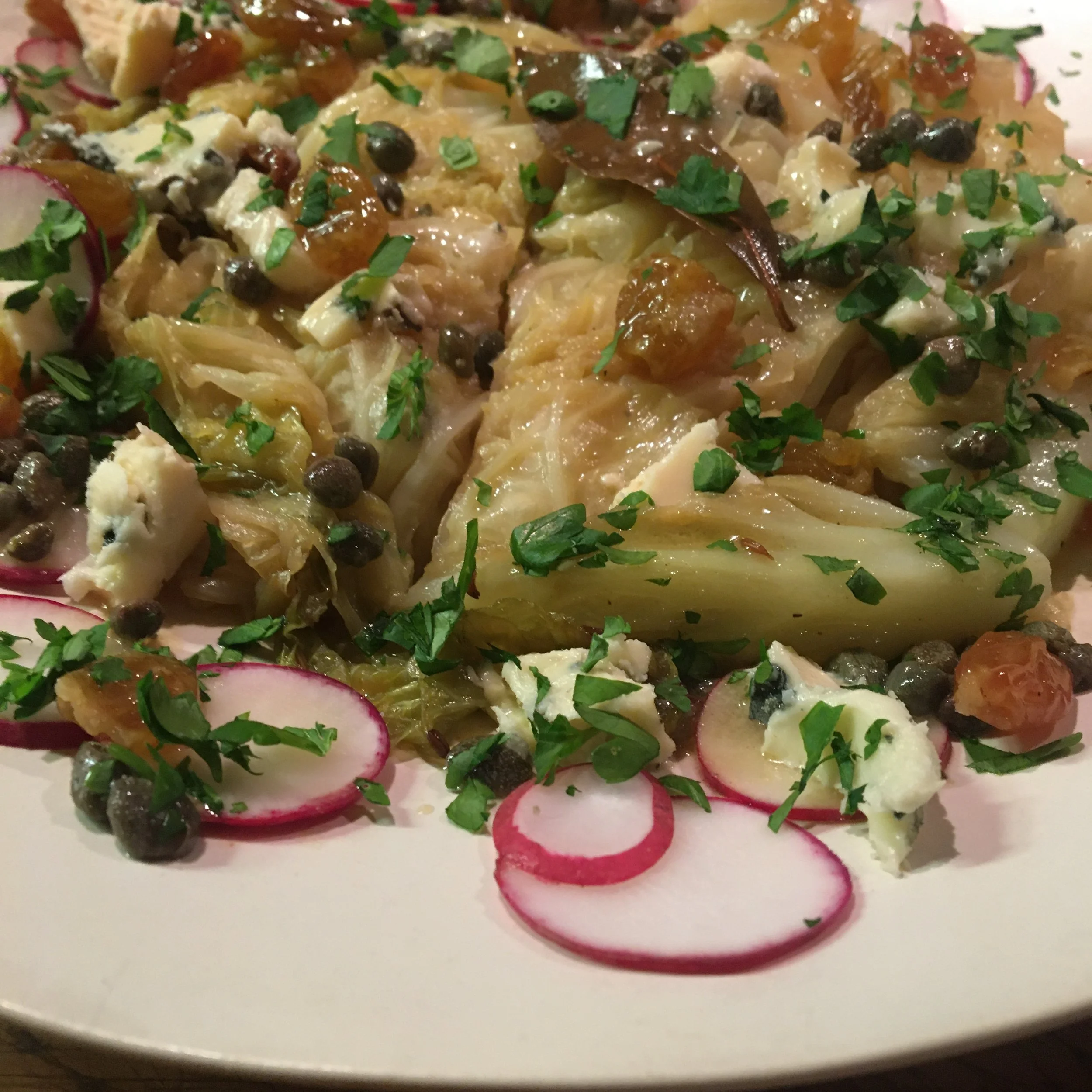 Braising transforms the cabbage into something tender and flavoursome. Add some creamy blue cheese and crisp radish and it reaches the next level.